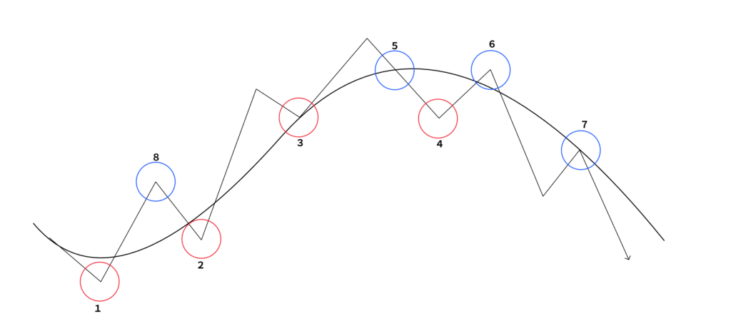 1.グランビルの法則の買い4つ(赤〇)・売り4つ(青〇)があります。